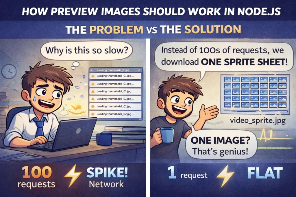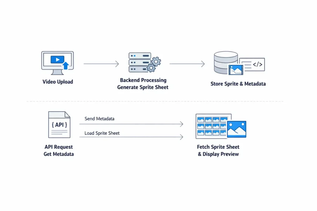 This post explains the sprite sheet concept end to end, from backend video processing in Node.js to frontend rendering in React, including chunking strategies and mobile optimizations that matter in real production systems.